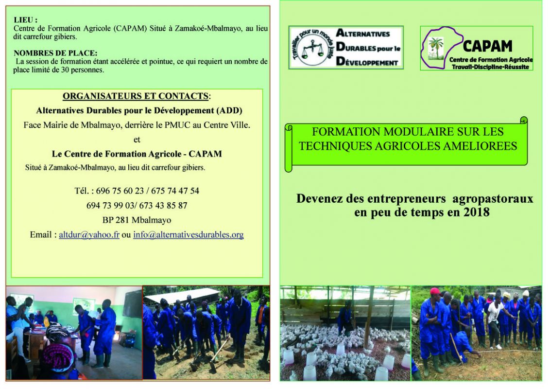 Bien vouloir consulter nos offres de formations agricoles (modulaires 2018). Lieu : Centre de formation Agricole (CAPAM), Mbalmayo, nombre de place limité.
